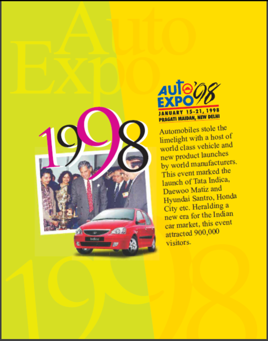 Automobiles stole the limelight with a host of world-class vehicles and new product launches by world manufacturers. This event marked the launch of Tata Indica, Daewoo Matiz and Hyundai Santro, Honda City etc. Heralding a new era for the Indian car market, this event attracted 900,000 visitors.